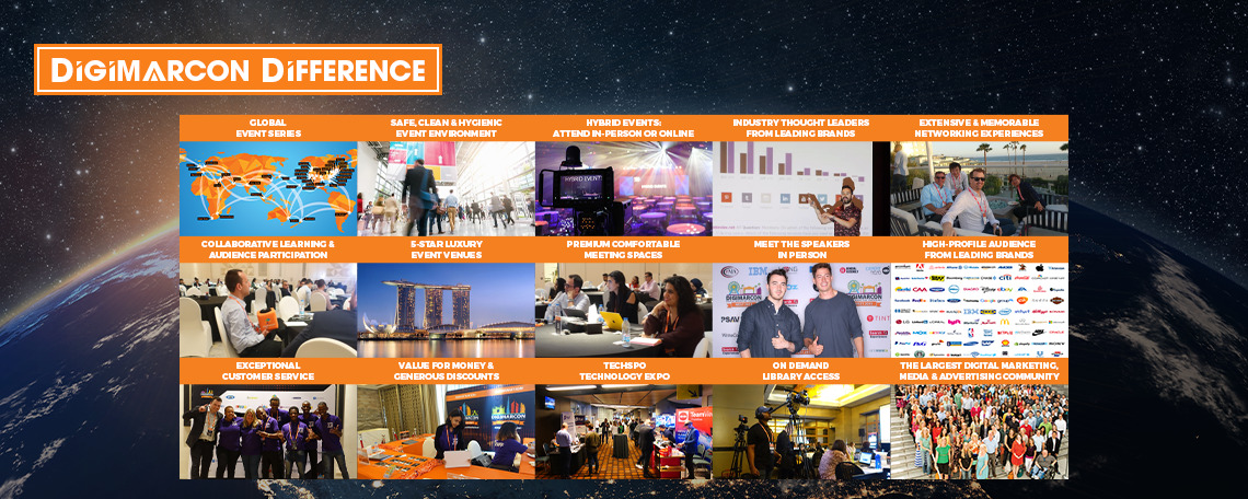 DigiMarCon is the Largest Digital Marketing, Media and Advertising Conference & Exhibition series in the world, with annual events held in all continents (North America, Latin America, Europe, UK, Asia Pacific, Middle East and Africa) in 13 countries (United States, Canada, Australia, New Zealand, United Kingdom, Ireland, Netherlands, Spain, Brazil, Singapore, India, United Arab Emirates and South Africa), across 33 cities (New York, Philadelphia, Boston, Toronto, Vancouver, Montreal, Houston, Dallas, Chicago, Los Angeles, San Francisco, Seattle, Washington DC, New Orleans, Atlanta, Detroit, Miami, Denver, San Diego, Phoenix, Las Vegas, Honolulu, London, Dublin, Amsterdam, Barcelona, Johannesburg, Cape Town, Dubai, Sydney, Auckland, Singapore and Sao Paulo). All DigiMarCon Events can be attended in-person or online. Wherever you are located there is a regional DigiMarCon event nearby you can attend.